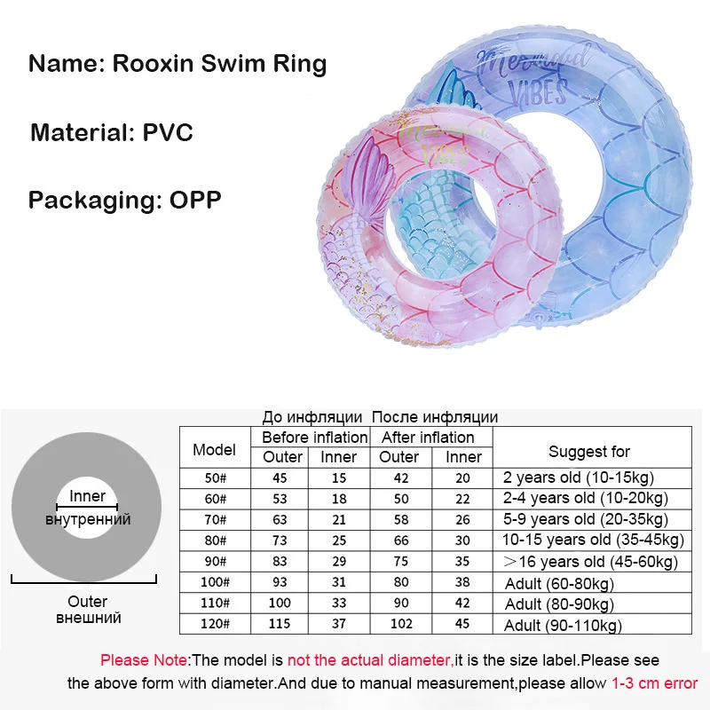 Rooxin Mermaid Swimming Ring Inflatable Pool Float For Adult Kids Swimming Circle Baby Swim Tube Water Play Swimming Pool Float